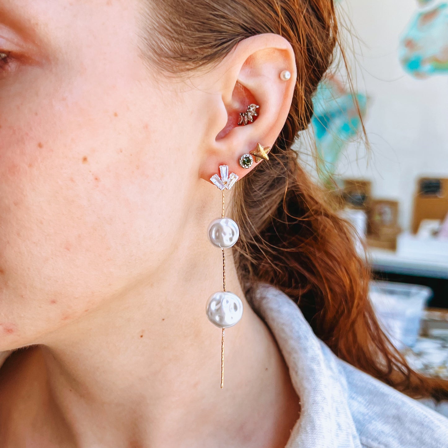 Multi Pearl Hoop Earrings in ear Close-up of an ear wearing a pearl hoop earring